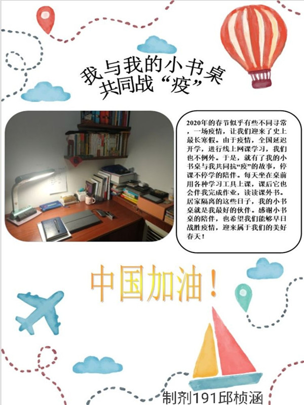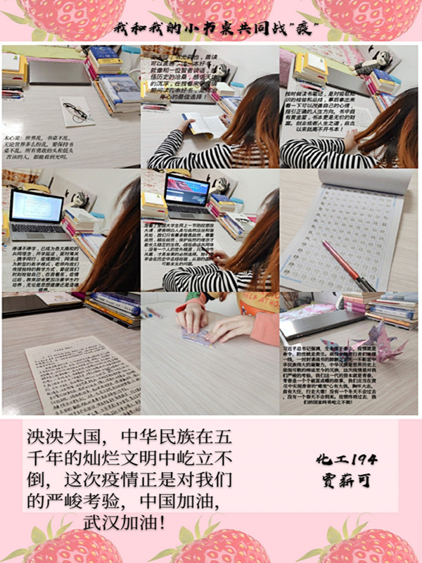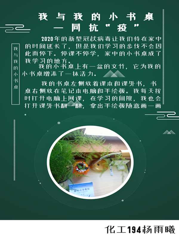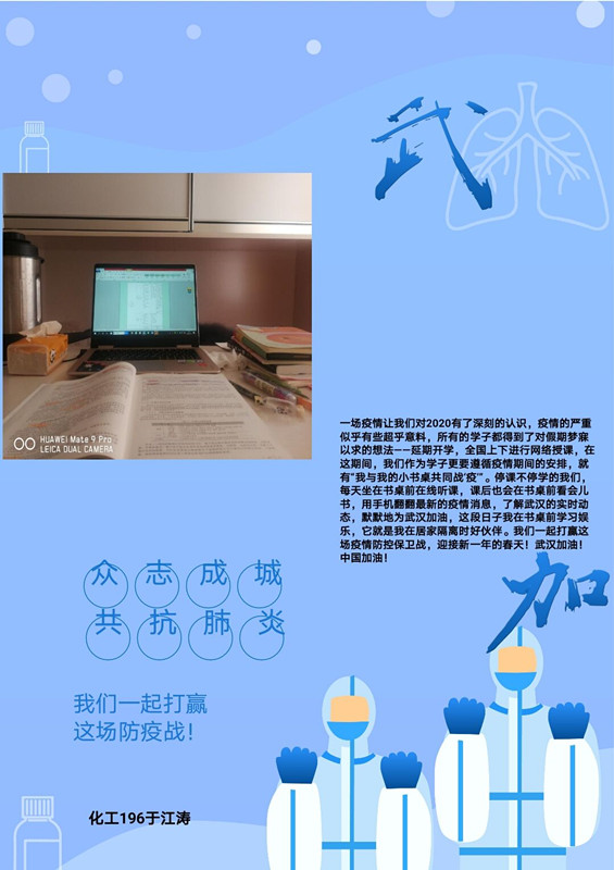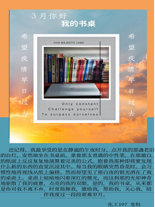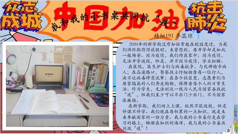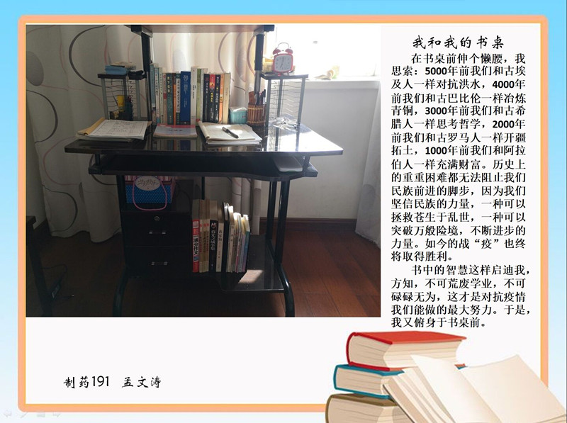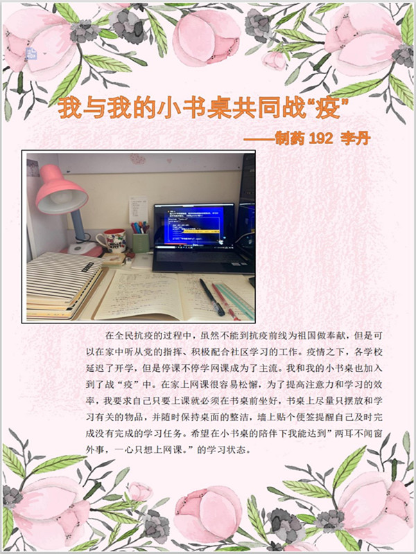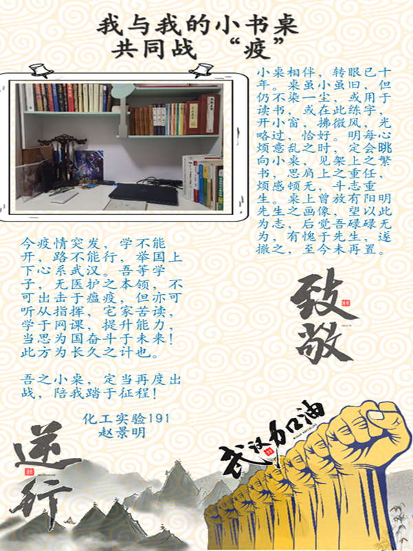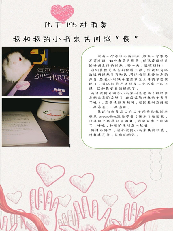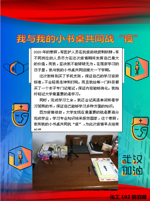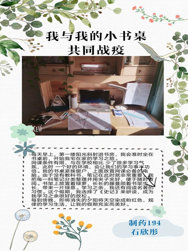 为了督促同学们养成良好的学习习惯,进一步端正学习态度,做到停课不停学,居家与自己的小书桌并肩抗“疫”,3月9日-15日,化工学院开展“我与我的小书桌共同战"疫"”征集活动。