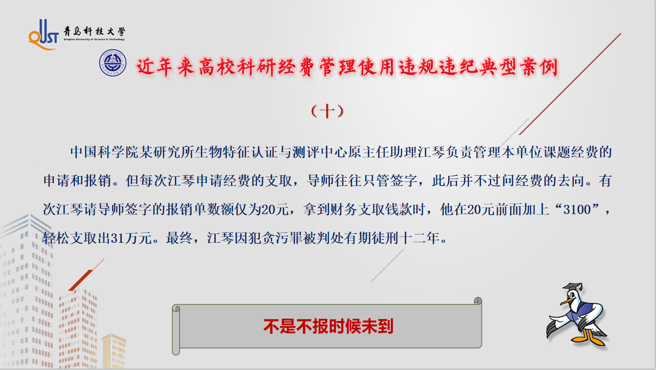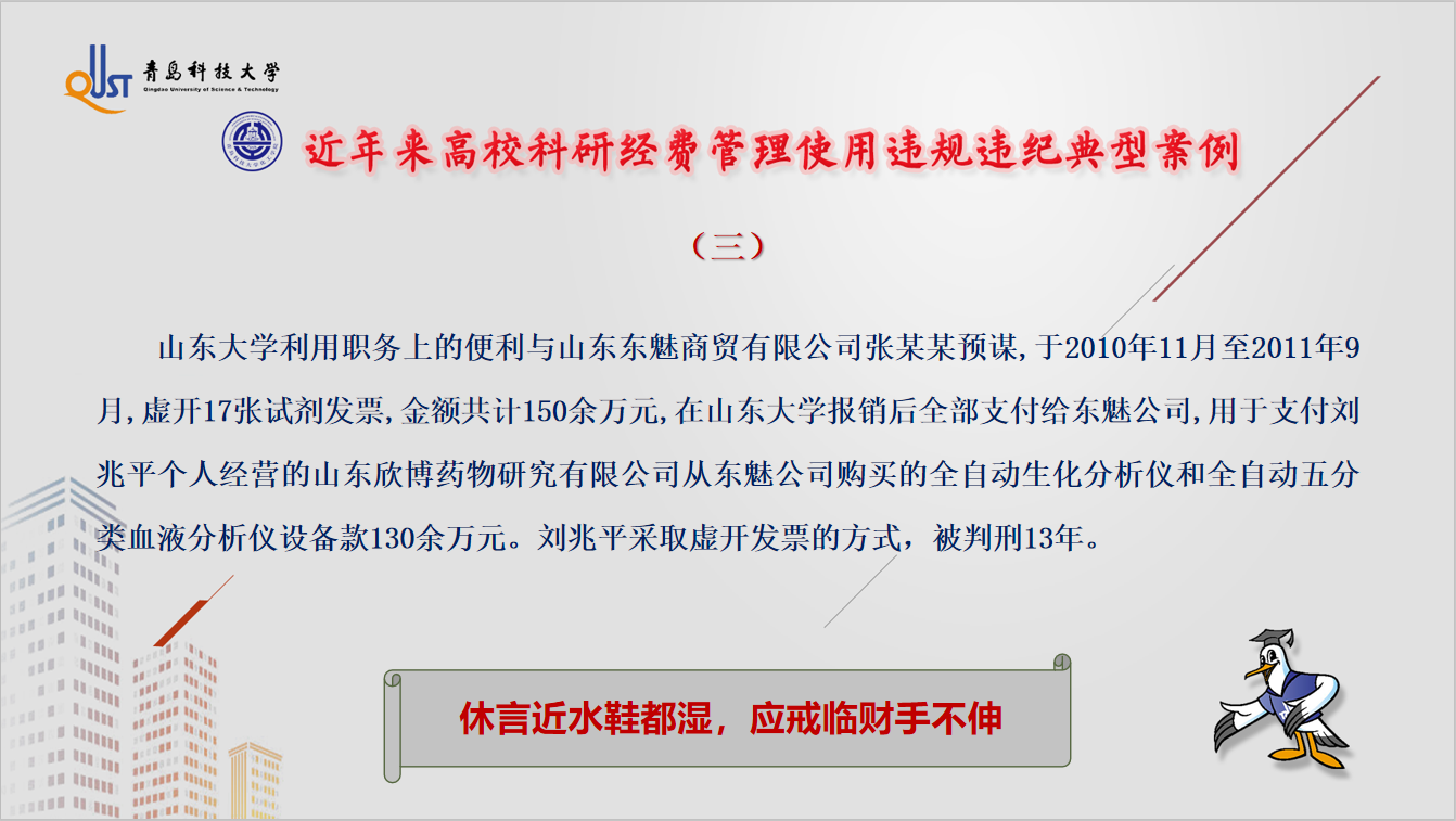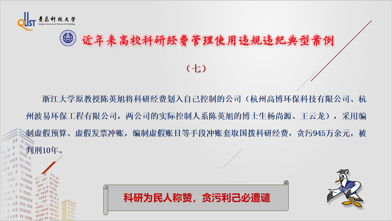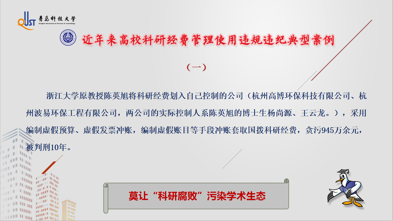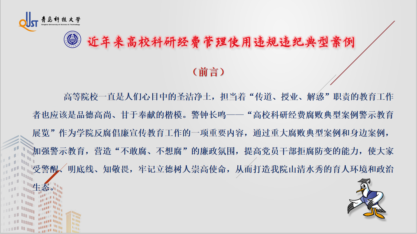 为深入落实好十九届中央纪委四次全会和省纪委十一届五次全会精神,依据学校党政工作要点,大力弘扬廉政文化,充分发挥廉政文化的引领作用和育人功能,根据青岛科技大学《关于开展第九届“廉政文化建设月”活动的通知》要求,化工学院创新工作模式,在疫情防控常态化背景下尽量减少人员聚集,充分利用网络开展高校科研经费腐败典型案例警示教育线上主题展览。