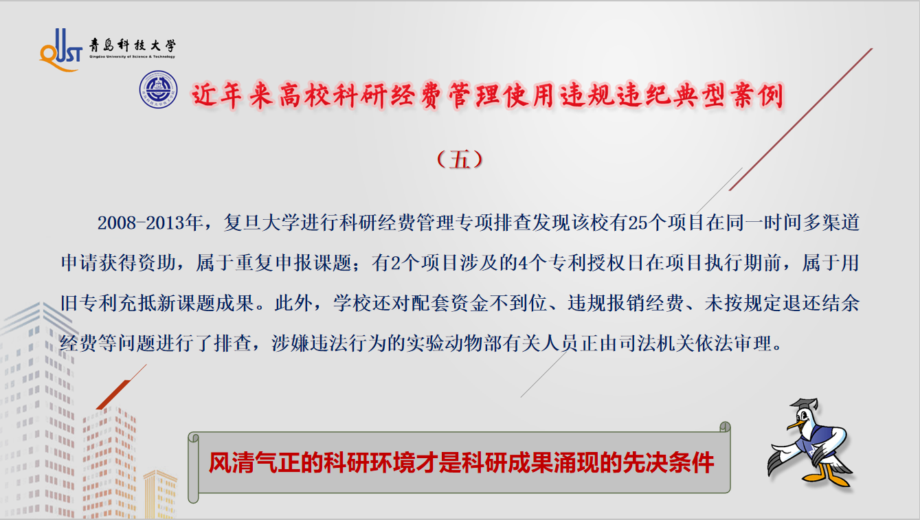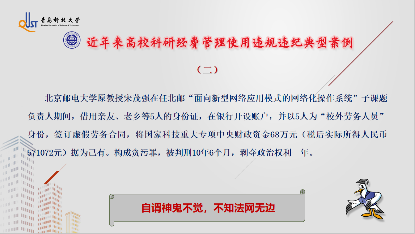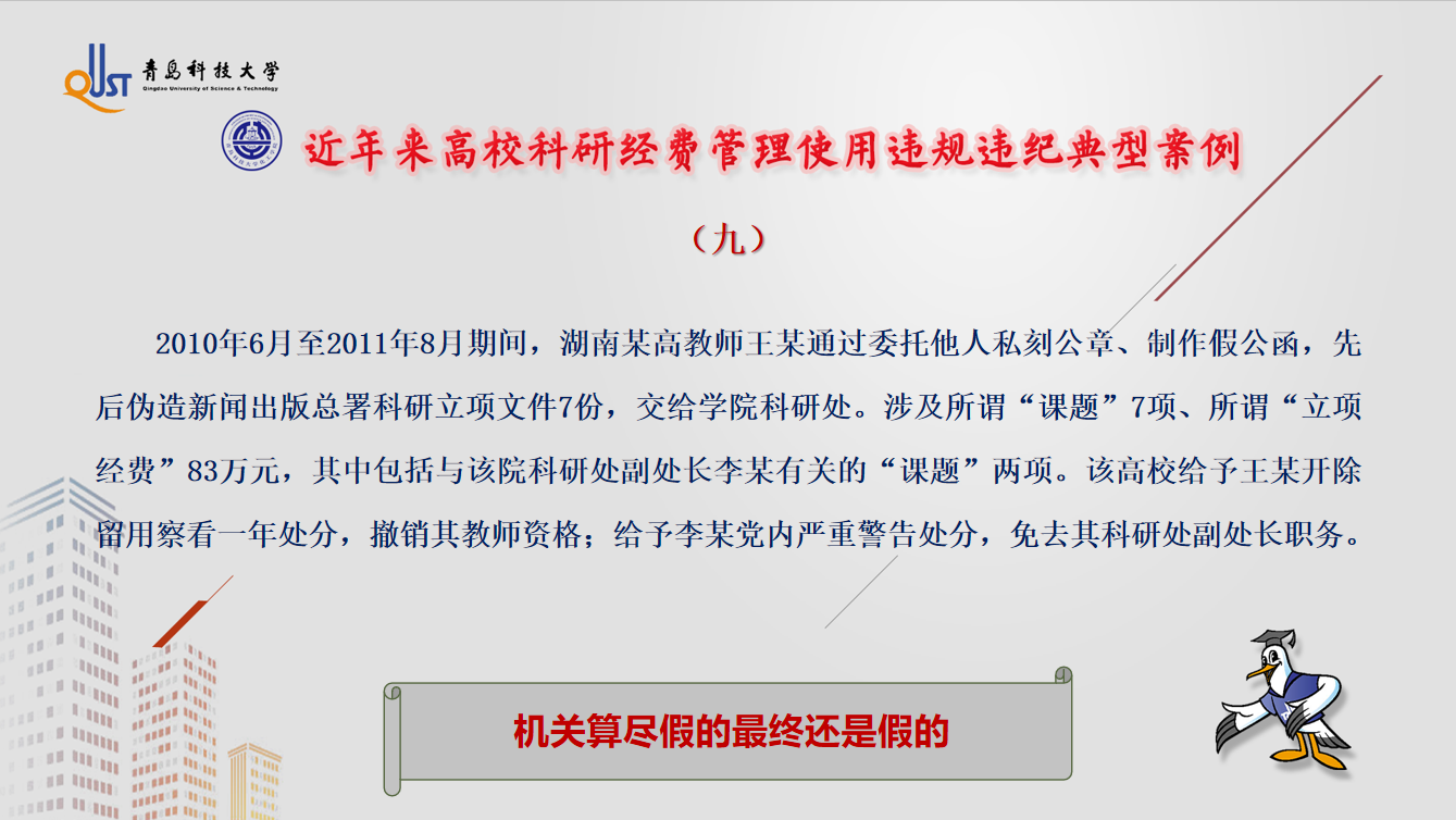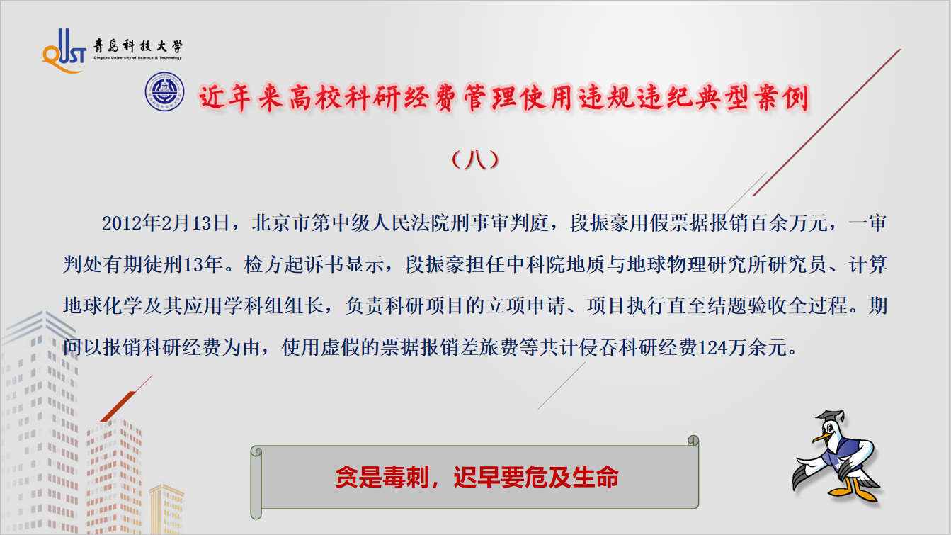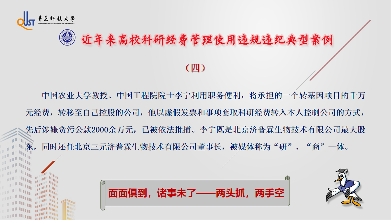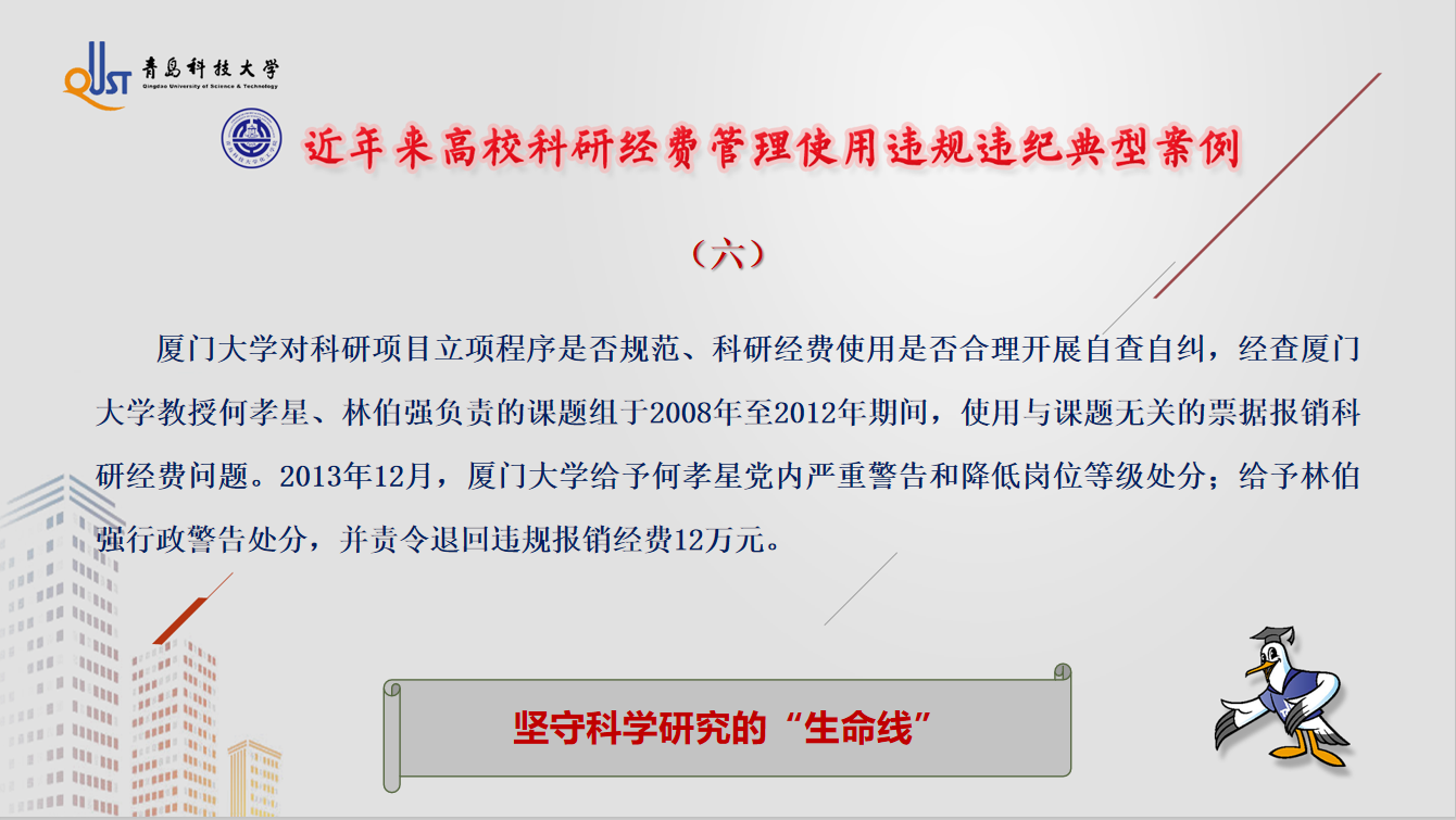 为深入落实好十九届中央纪委四次全会和省纪委十一届五次全会精神,依据学校党政工作要点,大力弘扬廉政文化,充分发挥廉政文化的引领作用和育人功能,根据青岛科技大学《关于开展第九届“廉政文化建设月”活动的通知》要求,化工学院创新工作模式,在疫情防控常态化背景下尽量减少人员聚集,充分利用网络开展高校科研经费腐败典型案例警示教育线上主题展览。