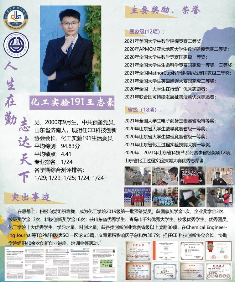 ◆聚焦主业,脚踏实地:综合测评成绩:94.83分,GPA:4.41,两项指标均位于年级排名第1名,一次性通过英语四、六级,获国家奖学金1次、一等英才奖学金4次、科技创新奖学金18次等各类奖学金35次,获山东省优秀学生、青岛市千名优秀大学生、校优秀学生、校优秀团员化工学院十大优秀学生等各类荣誉称号11项。