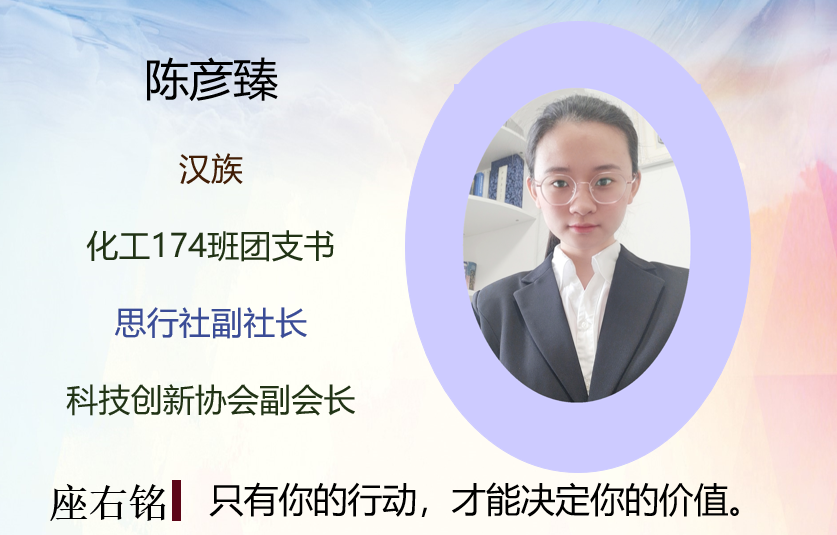 陈彦臻,女,1999年3月出生,山东省东营市东营区人,化工学院化工174班团支书。现住慧园乙楼南区307宿舍,各学期综合测评成绩位列班级第1。