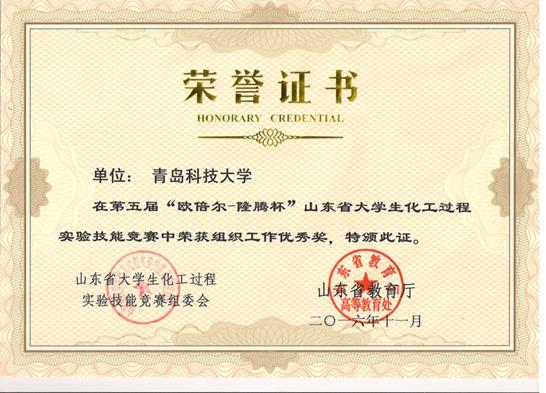 10) 青岛科技大学.第五届山东省“欧倍尔-隆腾杯”大学生化工过程实验技能竞赛组织工作优秀奖,2016.