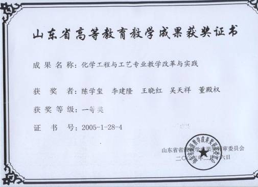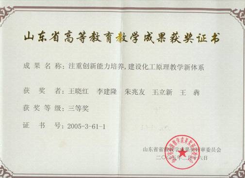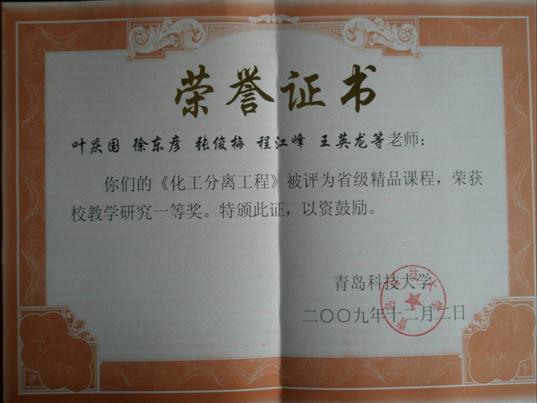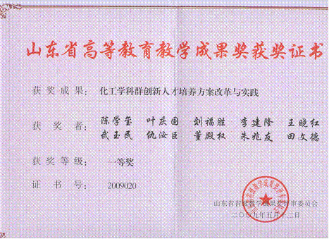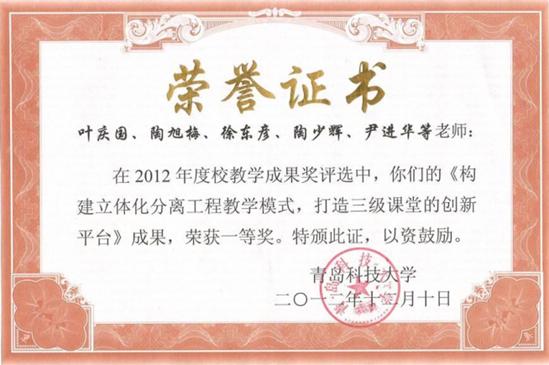 4) 叶庆国,陶旭梅,徐东彦,陶少辉,尹进华等.青岛科技大学教学成果奖一等奖,2012.