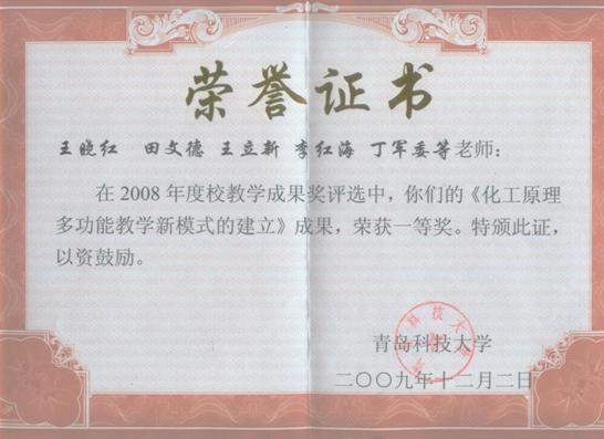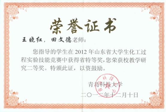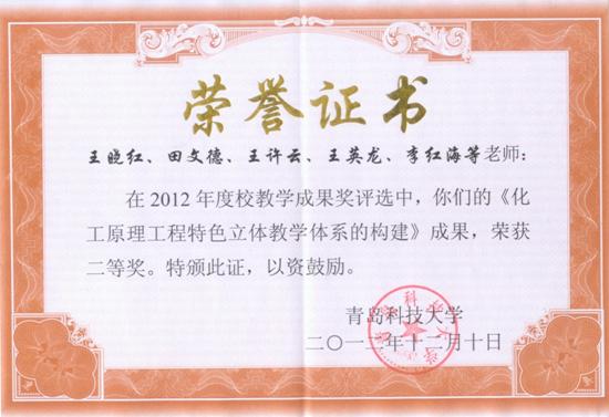 6) 王晓红,田文德,王许云,王英龙,李红海等. 2012年度青岛科技大学教学成果奖二等奖,2012.