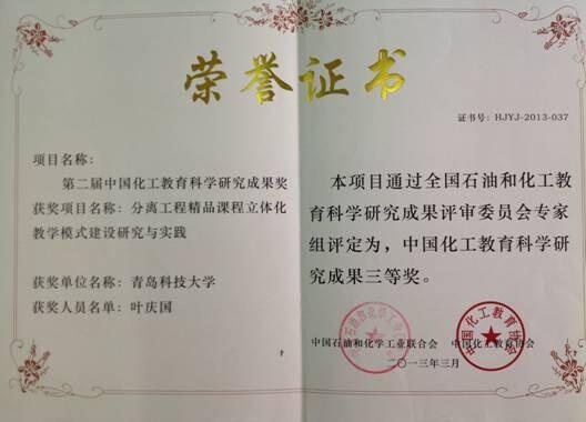 7) 叶庆国.中国化工教育科学研究成果三等奖,2013.