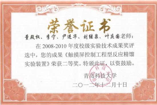 7) 董殿权,李宁,尹进华,刘继泉,叶庆国.青岛科技大学实验技术成果奖二等奖,2012.