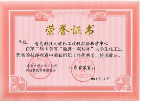 5) 青岛科技大学化工过程实验教学中心.第二届山东省“隆腾-双利杯”大学生化工过程实验技能竞赛组织工作优秀奖,2012.