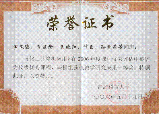 1) 田文德,李建隆,王晓红,叶臣,孙素莉等.青岛科技大学教学研究成果一等奖,2006.