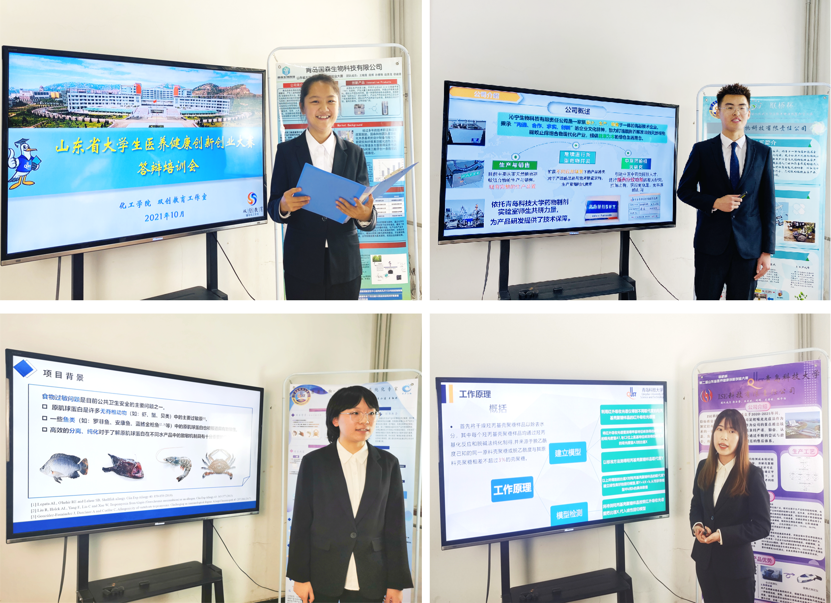 10月31日,由化工学院双创教育辅导员工作室组织的山东省大学生医养健康创新创业答辩培训会在一教1007举行,工作室成员耿赛、殷佳珞及各参赛团队答辩人参加。