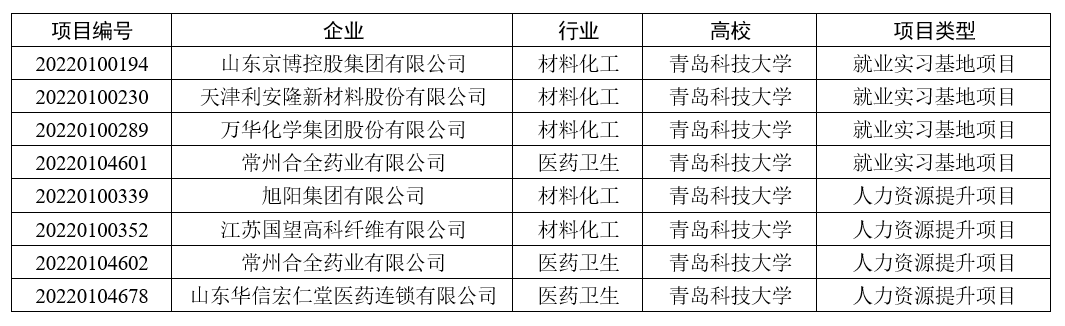 近日,《教育部高校学生司关于第一期供需对接就业育人项目立项名单的通知》(教学司函【2022】7号)公布了第一期对接就业育人项目名单。全国共有1268所高校参与申报,青岛科技大学获批立项40项,化工学院获批立项8项,其中,就业实习基地项目4项、人力资源提升项目4项。具体立项名单如下: