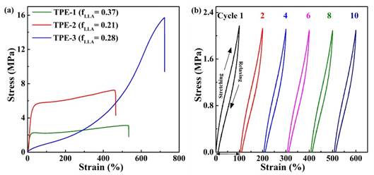 通过与L-丙交酯共聚,利用顺序加料法一锅制备了系列具有明确结构的聚乳酸-b-聚(δ-己内酯)-b-聚乳酸(PLLA-b-PδCL-b-PLLA)三嵌段共聚物。这些三嵌段共聚物随组成不同表现出热塑性塑料或热塑性弹性体的性质。其中PLLA150-b-PδCL700-b-PLLA150具有较高的弹性恢复率和断裂伸长率,与巴陵石化(牌号YH-788)和燕山石化(牌号SBS4412)生产的SBS热塑性弹性体性能相当。以辛酸亚锡为催化剂,三嵌段共聚物与乙醇回流6h,再通过减压蒸馏可以分离得到高纯度的乳酸乙酯(产率~92%)和δ-己内酯(产率~95%)。其中乳酸乙酯是一种高值化学品,常用作香料、食品添加剂和绿色溶剂。这也是首次报道的利用生物质来源的商品化单体为原料制备的可化学循环的热塑性弹性体材料。