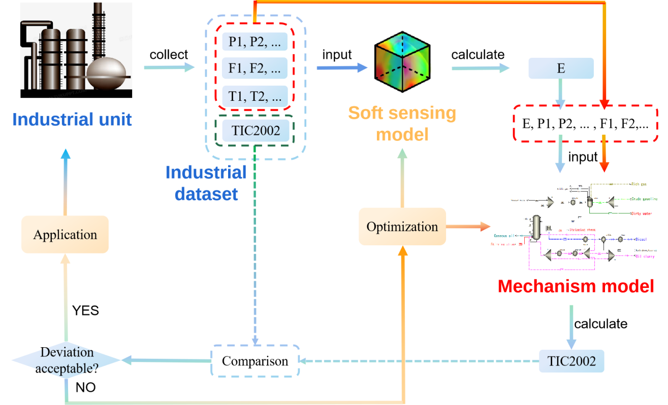其次,化工过程中存在大量不可观测的隐性变量,田文德教授团队以典型不可观测变量——精馏塔板效率为例,开展基于机理深度学习的软测量方法研究。他们利用大数据聚类凝聚装置的工况特征,作为机理建模的输入条件,开展分馏过程多特征工况模拟,获得塔板效率与过程可测参数的关联数据集。基于深度学习算法构建塔板效率的实时软测量模型,实现塔板效率的实时监测。所提技术的可靠性在工业催化裂化装置的分馏塔中得以验证,并在可靠性领域顶级期刊Reliability Engineering & System Safety(中科院一区TOP,IF=8.1)上发表了文章“Mechanism-based deep learning for tray efficiency soft-sensing in distillation process”(论文链接:https://doi.org/10.1016/j.ress.2022.109012)。青岛科技大学为论文的第一单位,化工学院田文德教授为论文的通讯作者,博士研究生王少辰为第一作者,实验室老师李传坤、刘彬、崔哲参与指导工作。