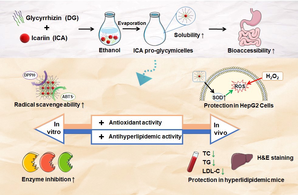 作者创新性地以植物小分子活性成分甘草酸作为载体协同增效地递送疏水性植物源性活性成分。高脂血症是一种涉及胆固醇水平失衡的疾病,现阶段一些患者需要辅助治疗来适当控制高脂血症。首先,作者对甘草酸作为功能性载体递送活性成分用于高脂血症辅助治疗进行了探究,制备了包载淫羊藿苷的甘草酸前体胶束,从而提高淫羊藿苷的溶解度、稳定性、体外与体内抗氧化活性、体外与体内抗高脂血症活性,为高脂血症辅助治疗提供了一个新的策略。该成果以以“Simple but novel icariin-loaded pro-glycymicelles as functional food: physicochemical characteristics, in vitro biological activities, and in vivo experimental hyperlipidemic prevention evaluations”为题发表在期刊《Food & Function》(https://pubs.rsc.org/en/content/articlelanding/2023/fo/d3fo02838k)。