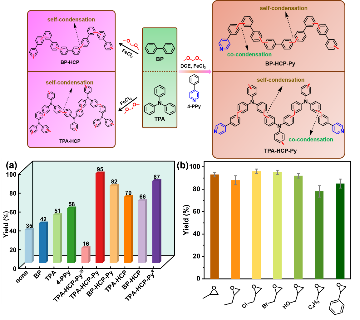 化工学院刘猛帅/刘福胜团队长期围绕CO2高值化利用领域存在的关键科学与技术瓶颈问题开展研究,近年来在CO2高效转化合成有机碳酸酯、喹唑啉-2,4(1H,3H)-二酮、苯丙炔酸、恶唑烷酮及其衍生物等高值精细化学品方面取得了系列进展,创制出了面向不同CO2转化路径的系列多功能催化材料(AIChE J., 2024, e18488; Sep. Purif. Technol., 2024, 329, 125196;J. Colloid Interface Sci., 2024, 656, 24–34; J. Colloid Interface Sci., 2024, 661, 1000–1010)。近日,团队在CO2高效转化合成环状碳酸酯新型多相催化剂的设计与开发方面取得重要研究进展。作者通过合理设计芳香类单体结构,基于傅-克烷基化反应原理,创制了系列超交联多孔有机聚合物催化剂。通过对催化剂的结构与性能进行调控与优化研究,发现该类催化剂可展现出规整的孔隙结构、高的比表面积和优异的稳定性,实现了无溶剂、无金属以及常压条件下高效催化CO2转化合成环状碳酸酯。