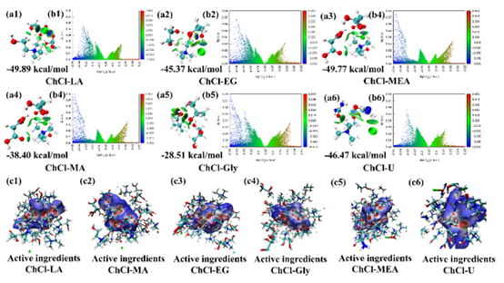 同时,研究成果以“Probing the interaction mechanism of choline chloride-based deep eutectic solvents with flavonoid and polyphenol systems”为题目,发表在知名国际期刊Journal of Molecular Liquids (SCI一区TOP期刊),论文DOI链接为doi.org/10.1016/j.molliq.2024.125310。论文第一作者为化工学院2023级硕士研究生魏家晖,通讯作者为徐环斐,青岛科技大学为第一单位和唯一通讯单位。论文基于分子模拟研究了六种不同类型低共熔溶剂提取花卉中活性成分过程中相互作用能、氢键数量、作用力类型以及溶剂分布程度,揭示了相互作用机制。采用量子化学计算以芦丁、没食子酸、花青素的结构为目标分子,探究相互作用反应位点,结果表明既有羟基又有氨基的乙醇胺作为氢键供体与氯化胆碱所形成低共熔溶剂在提取过程中展现出了最优的效果,解决了花卉活性成分提取效率低的问题。