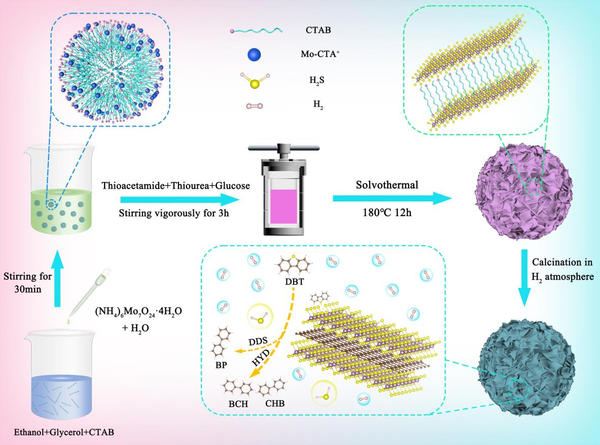 目前,世界各国对石油能源的依赖程度依旧很高。但是为了应对原油重质化和劣质化的趋势以及愈发严峻的环境污染问题,世界各国已设立了相关的法案以限制柴油中的硫含量,超低硫柴油(ULSD)的生产研究已成为科研工作者研究的热点。加氢脱硫(HDS)工艺作为生产ULSD的主要手段,其催化剂活性相的定向构建尤为关键。目前常用的MoS2基催化剂由于其有限的活性位点和半导体性质,严重限制了其HDS性能。而1T-MoS2扭曲的八面体结构和独特的类似于金属的性质使其具有了更大的层间距以及更高的电子传输性能。上述1T相结构的优异性质使得MoS2基催化剂实现超深度HDS成为可能。基于上述能源背景,化工学院黄婷婷副教授在Journal ofCatalysis期刊发表题为“Targeted fabrication of 1T-MoS2enriched nanosheets vertically oriented on spiny-shaped nanospheres with sufficient sulfur vacancies and “rim” sites for co-enhancing the hydrodesulfurization activity and hydrogenation selectivity”的研究论文,研究生武文哲为第一作者,黄婷婷副教授为通讯作者。