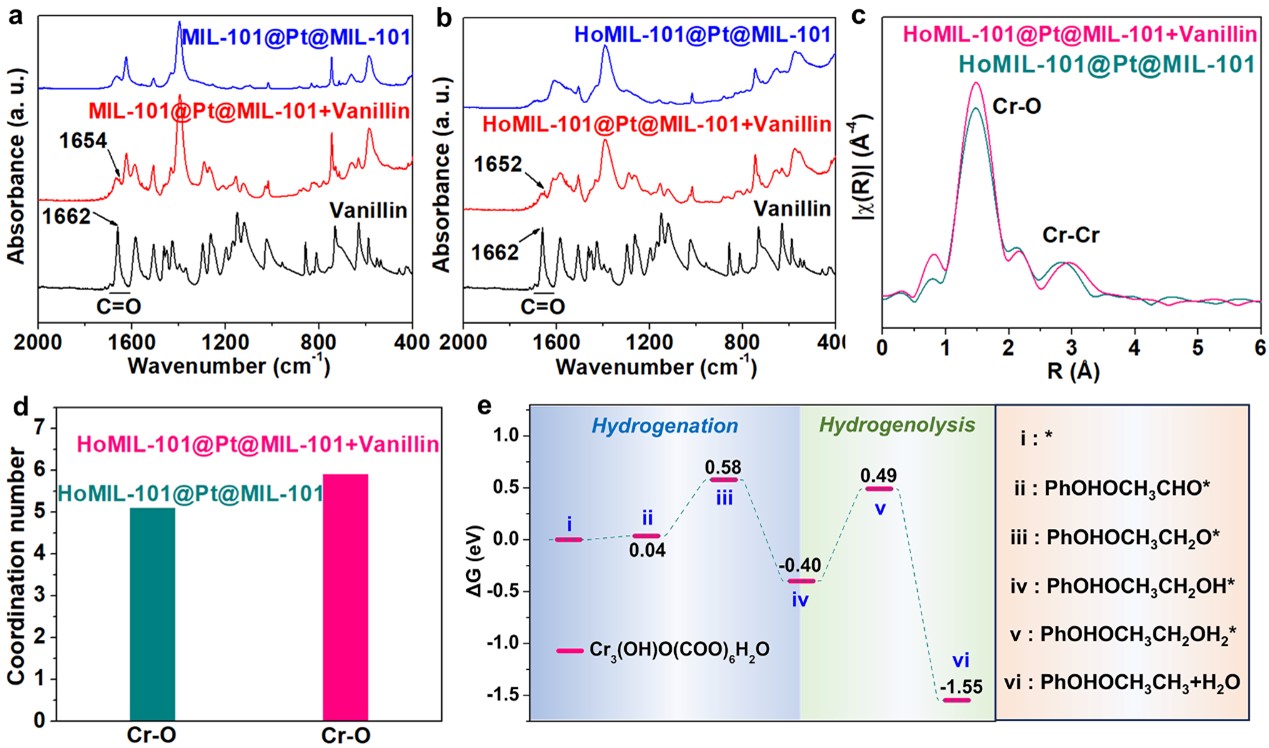 NH3-TPD、XPS和反应物富集实验表明,相比于实心结构,HoMIL-101@Pt@ MIL-101的优异催化活性主要来源于定义明确的纳米腔富集反应物促进质量扩散与转移。ATR-FTIR、原位同步辐射、氢溢流实验和理论模拟计算结果表明,香草醛主要吸附在MIL-101的不饱和Cr位点上并通过氢溢流加氢,加氢是速率控制步骤。