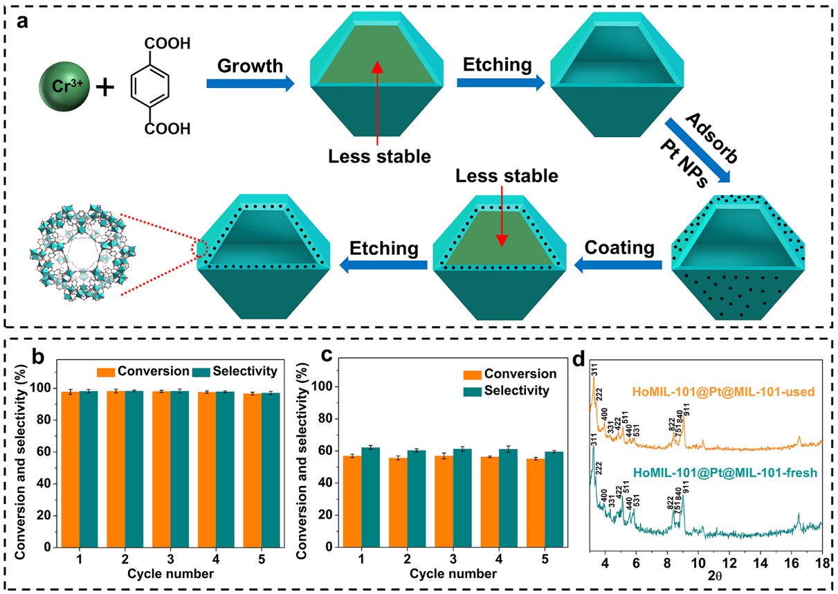 针对上述问题,化工学院王英龙/郑奉斌团队开发了一种“晶体生长和后蚀刻”的合成方法,构筑出了以Pt纳米粒子为夹层、以中空HoMIL-101为内核层和以MIL-101为外壳层的空心三明治结构催化剂,即HoMIL-101@Pt@MIL-101。该催化剂在140oC和0.1 MPa的氢气压力下实现了香草醛的完全转化以及对2-甲氧基-4-甲基苯酚100%的选择性,并具有良好的稳定性。在相同转化率下,其活性约为实心结构MIL-101@Pt@MIL-101的9倍,且综合性能优于商用的Pt/C催化剂以及目前报道的非均相催化剂。