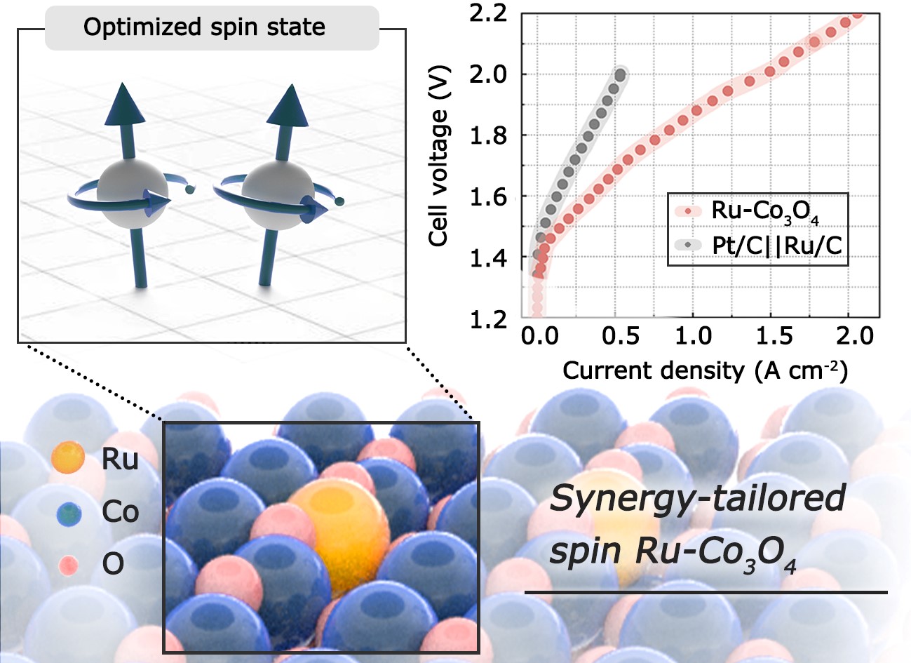 电解水制氢是实现碳中和的关键技术,其核心为析氧反应(OER)和析氢反应(HER)。这两种反应均依赖羟基中间体(OH*)的吸附行为,该行为直接影响电催化剂的活性与稳定性,进而决定水分解效率。在以(氢)氧化物为载体的钌单原子催化剂中,精准调控载体自旋态对优化OH*吸附、提升水分解效率至关重要。然而,在低钌负载条件下,传统调控策略难以有效调节载体自旋态,限制了水分解反应的整体性能。为突破这一瓶颈,研究团队提出了一种创新性的解决方案。通过强原子和电子协同作用,设计并合成了一种新型的单原子钌掺杂Co3O4催化剂(a-Ru-Co3O4)。该催化剂富含高自旋Co3+物种,这些高自旋Co3+不仅作为强OH吸附位点,显著促进了水分子的解离,还增强了向钌位点供应H中间体的能力,从而加速了HER反应的Volmer–Tafel路径。此外,高自旋Co3+还有助于形成和稳定O*–Ru–O–Co–OH*中间体,为OER反应提供了一种动力学更为有利的氧化路径机制。因此,a-Ru-Co3O4表现出优异的双功能催化活性,其质量和成本归一化性能分别比商业Ru/C高出约30倍。当集成到阴离子交换膜电解槽中时,a-Ru-Co3O4在2.0 V槽电压下实现了1.46 A cm⁻2的工业级电流密度,并展现出卓越的耐久性。