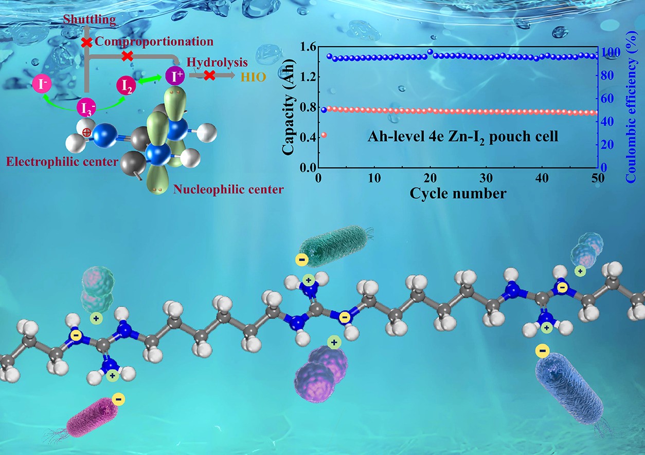 水系锌碘电池因其安全环保、资源丰富等优势而备受关注。传统的锌碘电池基于I-/I2转化反应,能量密度已无法满足应用需求。激活高电位I2/I+转化反应能够显著地提升锌碘电池的能量密度,使其在大规模储能领域展现出广阔的应用前景。然而,I+物种在水系电解液中稳定性差,易水解,导致I2/I+转化反应的可逆性差。此外,在实用化载量条件下,碘正极的机械结构稳定性亦面临着巨大挑战。针对以上问题,刘杰副教授团队提出基于兼具亲电基团和亲核基团的PHMG粘结剂构筑四电子锌碘电池的新思路。PHMG中的亲核基团–NH–能够与I+物种形成稳定的电荷转移复合物,从而有效地抑制I+物种的水解。同时,PHMG中的亲电基团–C=NH2+能够强有力地锚定I3-物种,从而抑制其穿梭及其与I+物种的归中反应。此外,与传统的PVDF粘结剂相比,PHMG粘结剂具有优异的力学性能,能够有效地维持高载量碘正极的机械结构稳定性。因此,基于PHMG粘结剂,载量为32.73 mg cm−2的碘正极能够展现出9.65 mAh cm−2的超高面积比容量。最终,Ah级锌碘软包电池(0.76 Ah)亦被成功构建,表明该四电子锌碘电池构筑新策略的可行性与实用性。