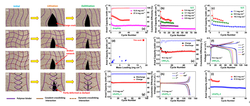针对高载量电极结构不稳定这个难题,该工作提出新的聚合物粘结剂设计概念,以价格便宜、环境友好的黄原胶和聚丙烯酸为原料,通过聚合反应制备出机械性能强健的3D网络结构粘结剂。由于双螺旋结构的黄原胶能够部分地打开/变形和自愈合,该粘结剂可作为一个高效的“减震器”,有效地缓冲高载量电极在充放电过程中产生的应力,维持电极的完整性。同时,研究表明该粘结剂具有很好的普适性,可应用于正极材料、负极材料、纳米材料和微米材料。
