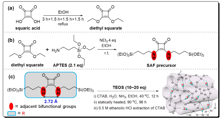 鉴于当前催化体系存在的难以分离回用、稳定性差和反应条件苛刻等缺陷,刘猛帅副教授所在课题组长期致力于新型多功能催化剂的设计与开发研究,取得了系列具有重要参考价值的研究成果。近日,我校化工学院刘猛帅副教授在CO2吸附活化及高效转化合成环状碳酸酯领域取得新进展,通过对催化剂结构设计及活性位点的合理调控,构建出方酰胺衍生基活性组分修饰的周期性介孔有机硅催化体系,该功能材料具有高比表面积、Lewis碱与双氢键供体共修饰的结构特点,对CO2表现出优异的选择性吸附性能,同时在温和、无溶剂、无金属条件下实现了CO2的高效催化转化,为发展新型催化材料提供重要指导。相关工作以“Squaramide-derived framework modified periodic mesoporous organosilica: A robust bifunctional platform for CO2 adsorption and cooperative conversion”为题发表于化工领域TOP期刊《Chemical Engineering Journal》,DOI: 10.1016/j.cej.2020.125682。该成果以刘猛帅副教授为第一作者,刘福胜教授与哈尔滨工业大学孙建敏教授为共同通讯作者,青岛科技大学为第一通讯单位。
