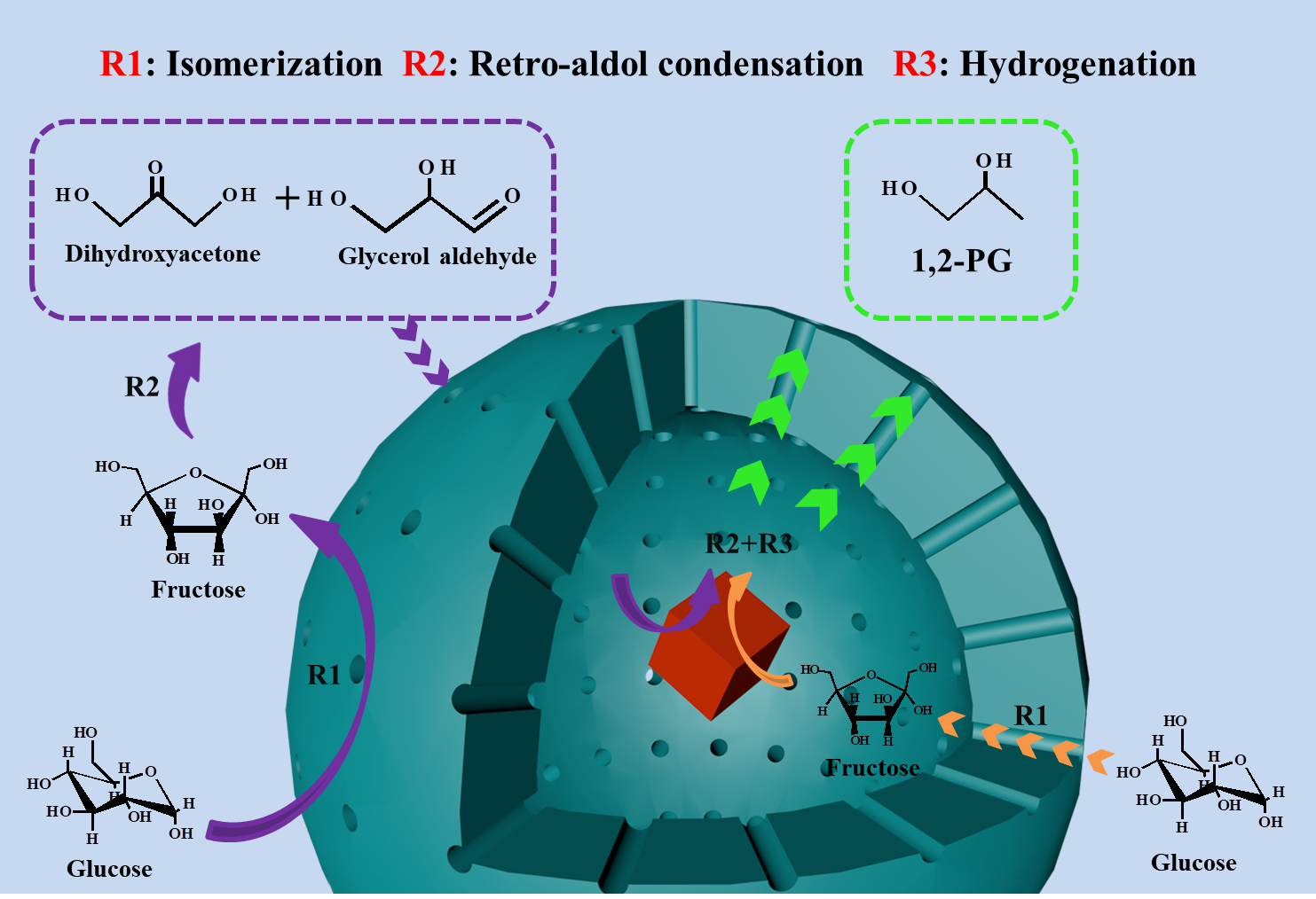 团队针对目前葡萄糖制备1,2-丙二醇催化剂选择性低、稳定性差等缺陷,创制以具有加氢性能的纳米金属粒子为内核,富含Lewis酸位点的二氧化硅为外壳的新一类核壳型双功能催化剂;依据孔结构、酸性可调控以及内核活性组分得到有效保护等特性,解决了以生物质为原料合成1,2-丙二醇选择性低与催化剂稳定性差的问题;揭示了新一类核壳型双功能催化剂的金属种类、孔结构、酸特性等因素与定向制备1,2-丙二醇之间的本质规律,明确了催化葡萄糖制备1,2-丙二醇的反应机理,完成了催化剂的分离回收与循环使用,为制备1,2-丙二醇开发了一条绿色、经济的非石化路线,同时为实现葡萄糖的高值利用提供了绿色高效新途径。