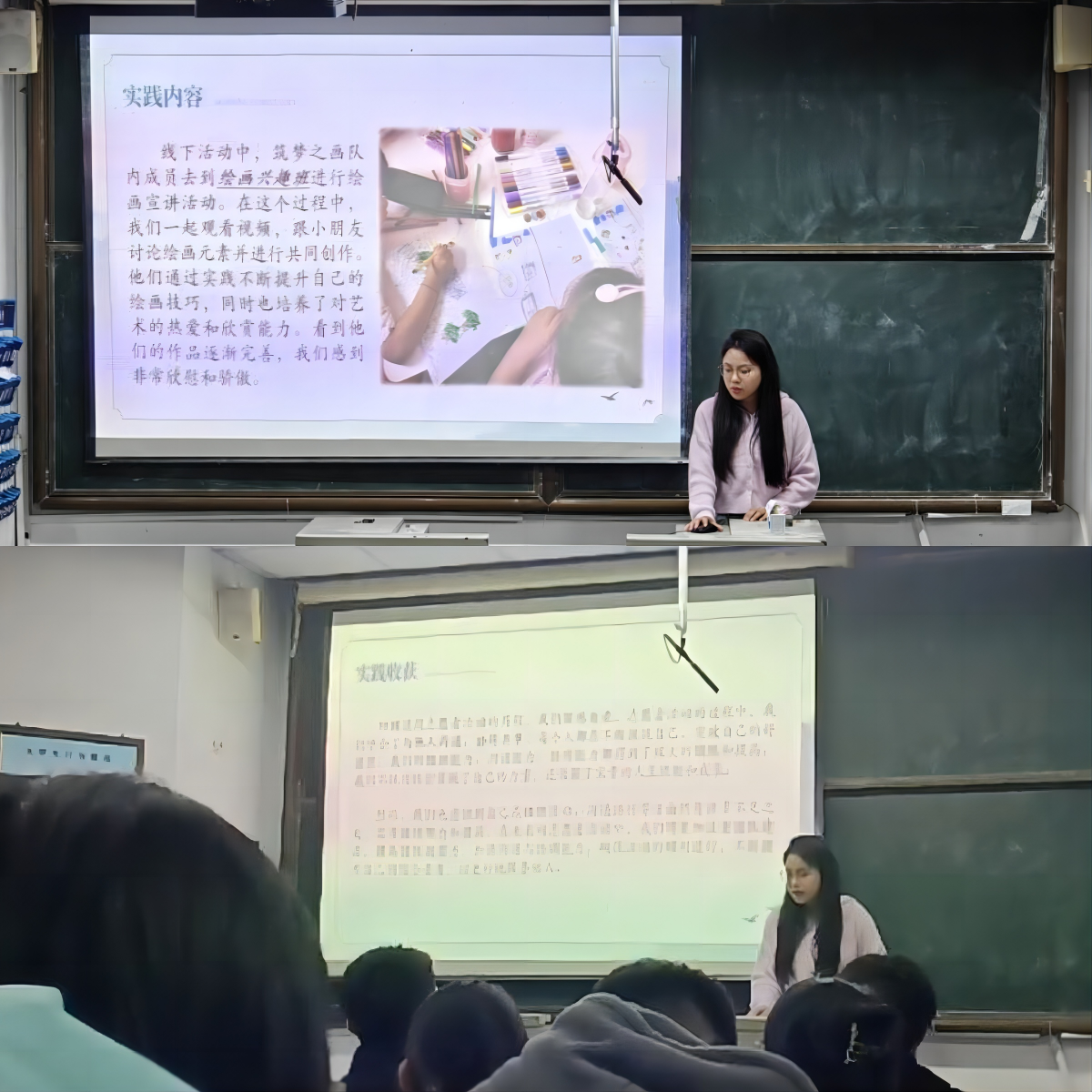 团队成员王文婧以饱满的热情、精美的课件和专业的知识,向在场的老师和同学们讲解了中国历代绘画的发展历程和艺术特色。通过通俗易懂的话语将深奥的绘画艺术知识娓娓道来,带领大家走进了历代绘画的演变历程,系统总结了筑梦之画团队在此之前开展的实践过程和宣讲形式、内容、受众。