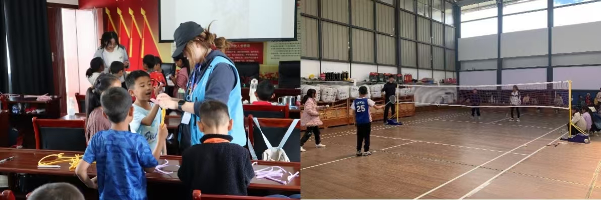 下午的体育课也活力满满。热身环节的折返跑后,志愿者示范羽毛球握拍与发球动作,孩子们继续练习。每一次挥拍,不仅是对运动技能的探索,更是对语言能力与团队精神的锤炼。场边的“加油”“好球”等喝彩声此起彼伏,运动的活力与语言的魅力交织,展现出乡村少年昂扬向上的精神风貌。